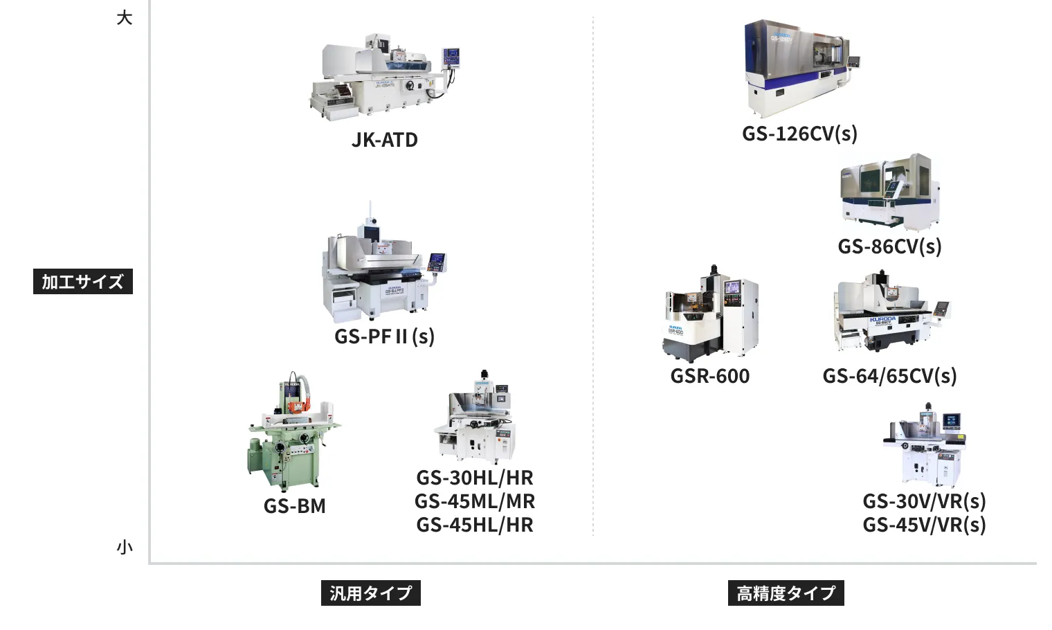 省エネ、省スペース、高い操作性が特徴の成形平面研削盤。環境性能と多様化する加工ニーズへの対応を両立しながら『使い易さ』を追求しました。対話型ソフト「GS-SmartTouch®」が搭載可能なユーザーフレンドリーの次世代マシンです。