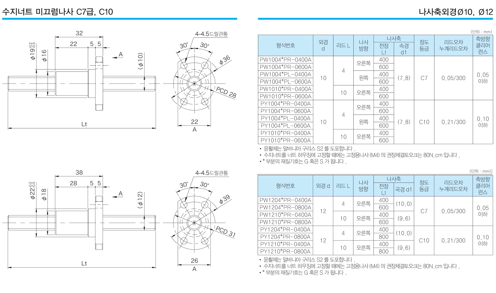 나사축 외경 φ10, φ12mm, 정도등급C7, C10급