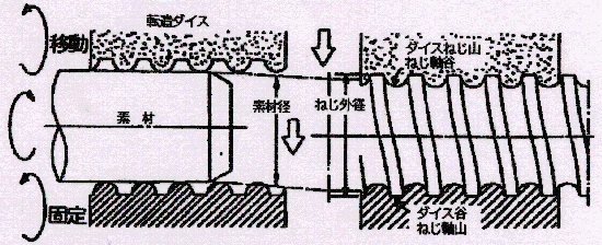 전조 볼스크류의 나사축은 봉형태의 강재를 회전시키면서 전조다이스라고 불리는 공구에의해 나사홈을 성형하는 방법입니다.