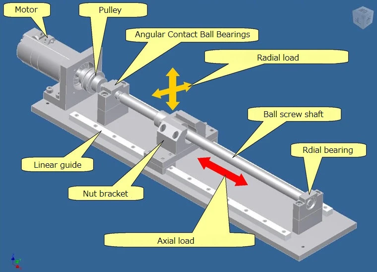 볼 스크류와 조합하는 베어링의 주요 역할 중 하나는 볼 스크류에 작용하는 축 방향의 하중(추력, 혹은 반력)을 받아들이기 위해서입니다.