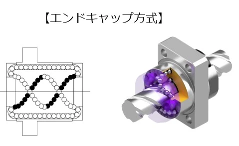 너트의 양단에 장착하는 앤드캡에 강구를 다시 끌어올리는 기능을 갖춘 순환방식입니다.