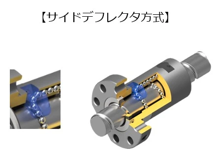 너트의 양 끝에 장착하는 엔드디플렉터에 강구를 다시 끌어올리는 기능을 갖춘 순환방식입니다. 너트본체에 강구가 오가기 위한 관통구멍이 설치되어 있습니다. 지금까지의 설명은 앤드캡과 동일하지만 차별점으로는 고주속성이나 정숙성을 들 수 있습니다. 부드러운 강구의 흐름을 추구하여 설계되었기 때문에 무리가 없는 움직임으로 강구가 순환, 컴팩트성을 가지면서 성능 향상을 실현했습니다.