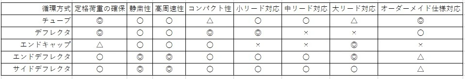 그러나 표와 같이 각각의 특징(정격하중, 정숙성, 고주속성, 컴팩트성, 리드대응, 주문제작 대응여부)과 요구사양을 감안했을 때, 일률적으로 모든 것이 우수한 순환방식은 없기 때문에 밸런스를 감안한 선정이 필요합니다.