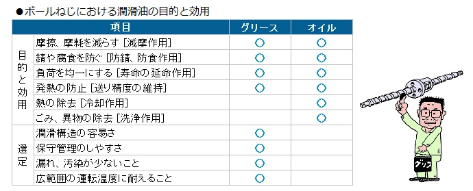 윤활이란 「기계 등의 접촉면의 마찰을 적게 하는 것」입니다. 볼스크류에서 윤활제의 역할은 마찰, 마모를 감소시키고 방청, 냉각, 세정 효과와 장기간에 걸쳐 볼스크류가 갖는 우수한 특성, 기능을 유지시키는데 있습니다. 윤활제를 크게 나누면 구리스와 오일 2종류가 있으며 사용조건, 사용목적에 맞는 선정이 필요합니다.