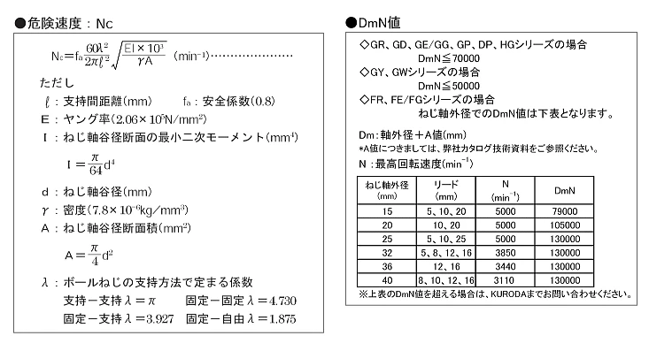 볼스크류를 위험속도 이상의 회전속도로 사용하면 발생하는 진동에 의해 기계 장치의 정밀도에 문제가 발생합니다. 볼스크류는 위험속도의 80%이하의 회전수로 사용할 것을 권장합니다.